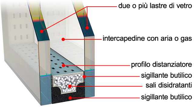 Dal momento che il vetro rappresenta la maggior parte della superficie dell’infisso, le sue prestazioni termiche sono importantissime. Nell’immagine vediamo rappresentata una vetrata basso emissiva con le varie componenti che la costituiscono.
