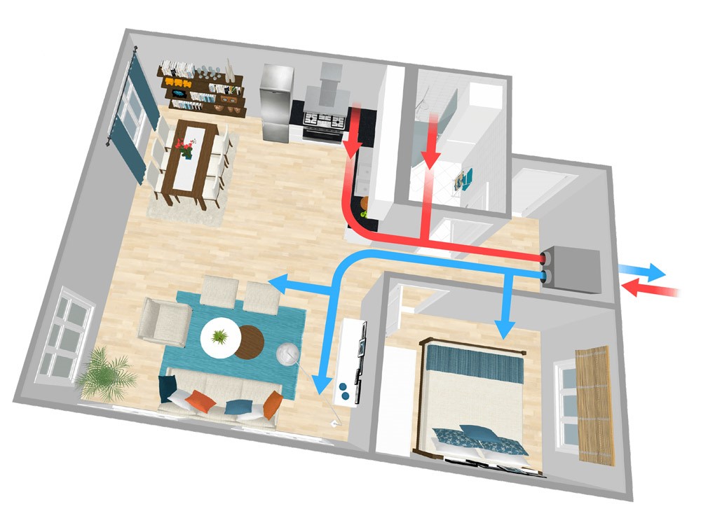 - Riduzione dell’umidità relativa: l’espulsione dell’aria interna avviene da bocchette di aspirazione posizionate nei locali più umidi come bagni e cucine, di conseguenza l’umidità viene espulsa assieme all’aria